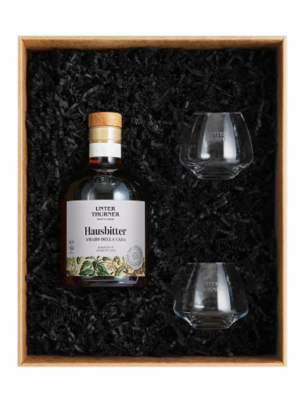 La confezione regalo è completata da due bicchieri Premium Unterthurner e da un'attraente scatola regalo.